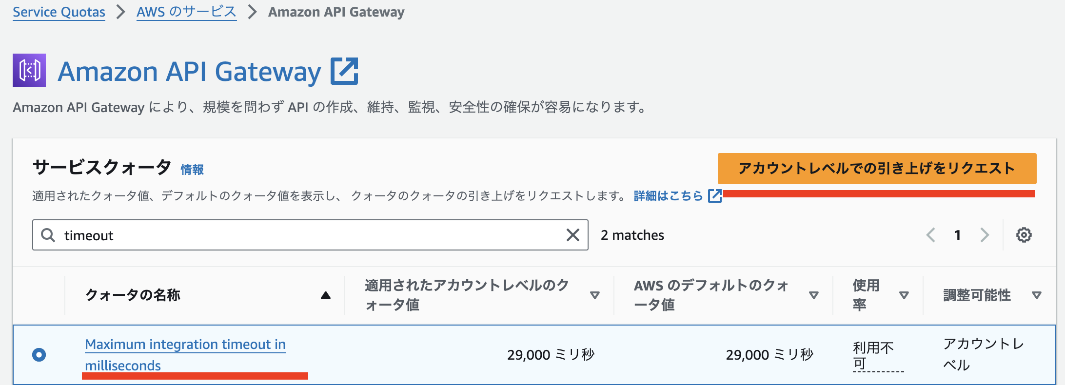 Service Quotasを確認すると以下の通り、統合タイムアウトが、アカウントレベルでの引き上げリクエスト可能になっています。