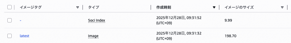 Pushしてしばらくすると、以下のようにECRにSoci Indexが追加されます。