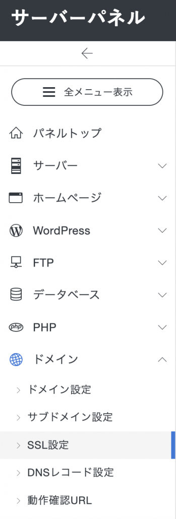 サーバーパネルからSSL設定を押下して、SSL設定状況をONにするとSSL化完了です!
