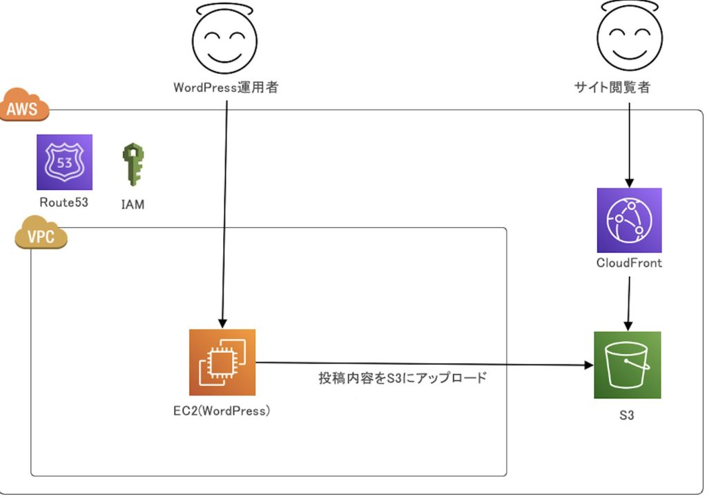 まずゴールイメージです。以下のような構成となります。サイト閲覧者はCloudFront経由でS3に格納されたコンテンツ(WordPressコンテンツを静的HTMLにしたもの)にアクセスすることになります。